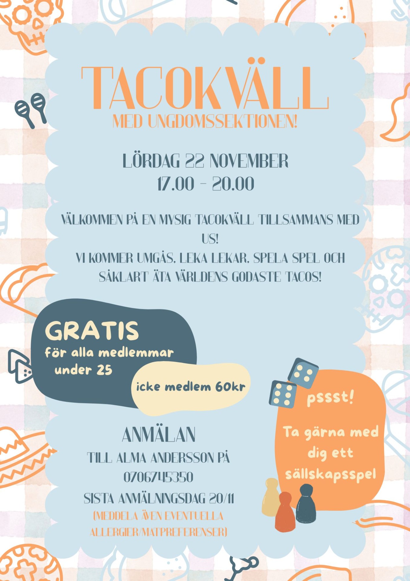 Ungdomssektionen bjuder in alla medlemmar under 25 år på en helmysig tacokväll! Det bjuds på lekar, spel och den godaste tacosen ni någonsin ätit!😍🌮